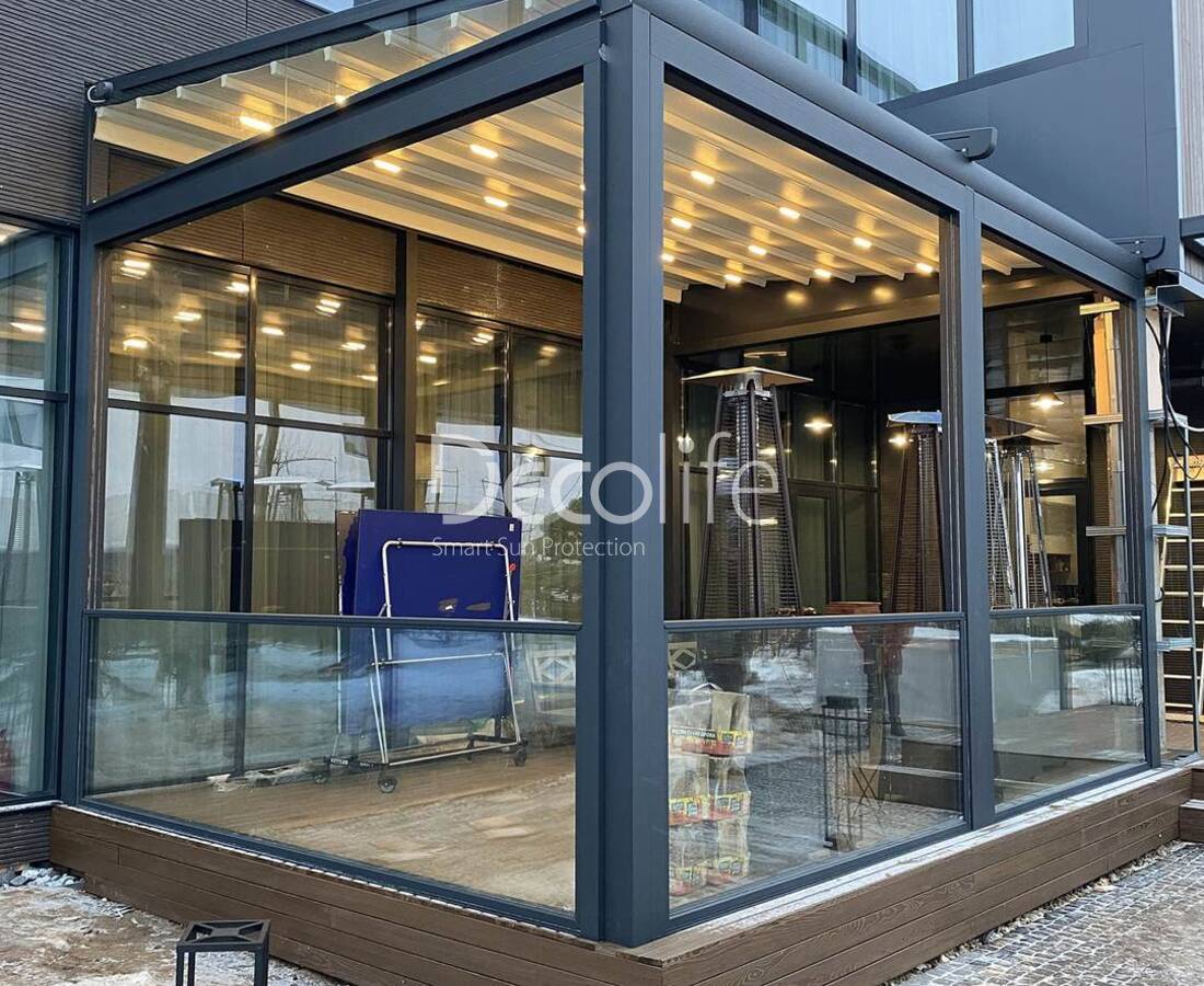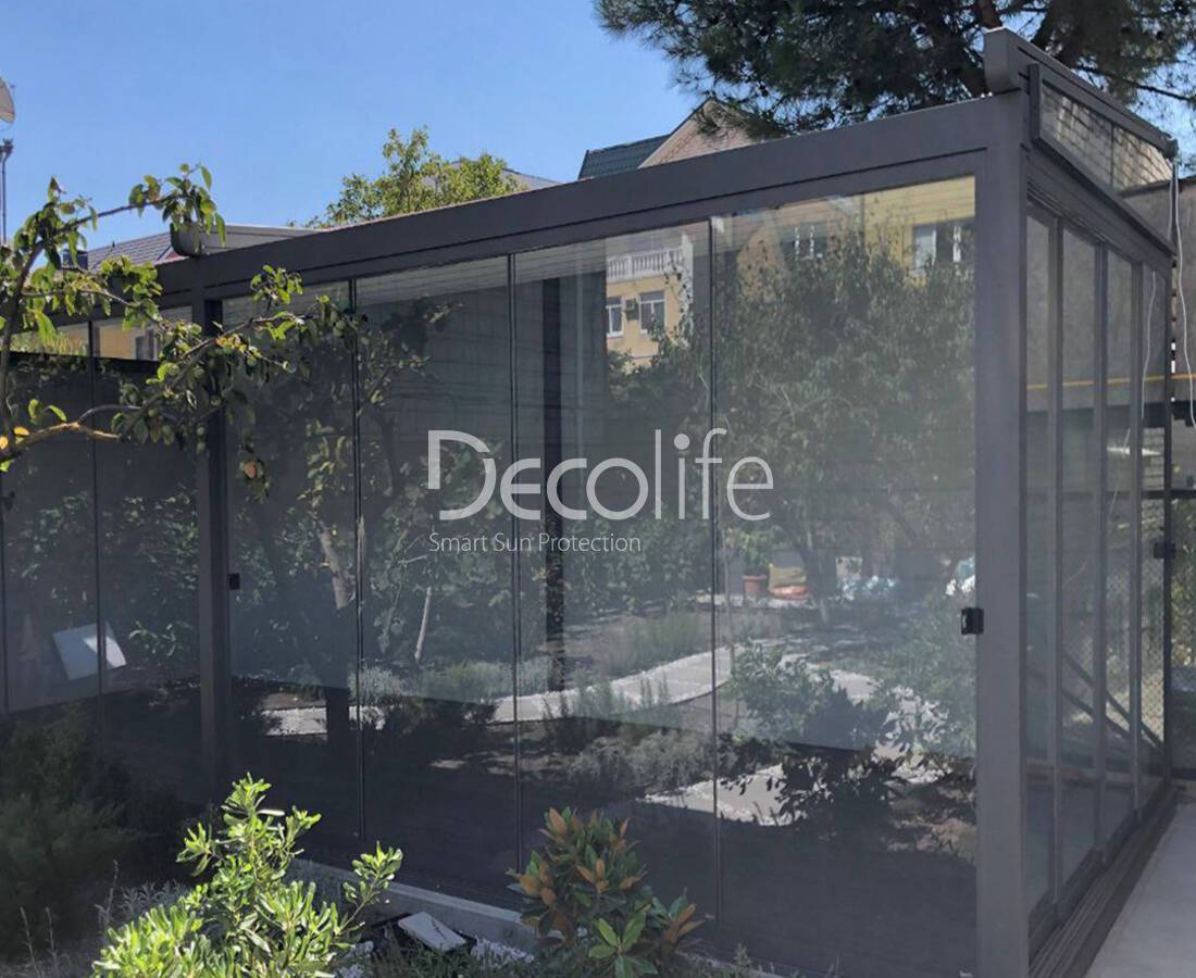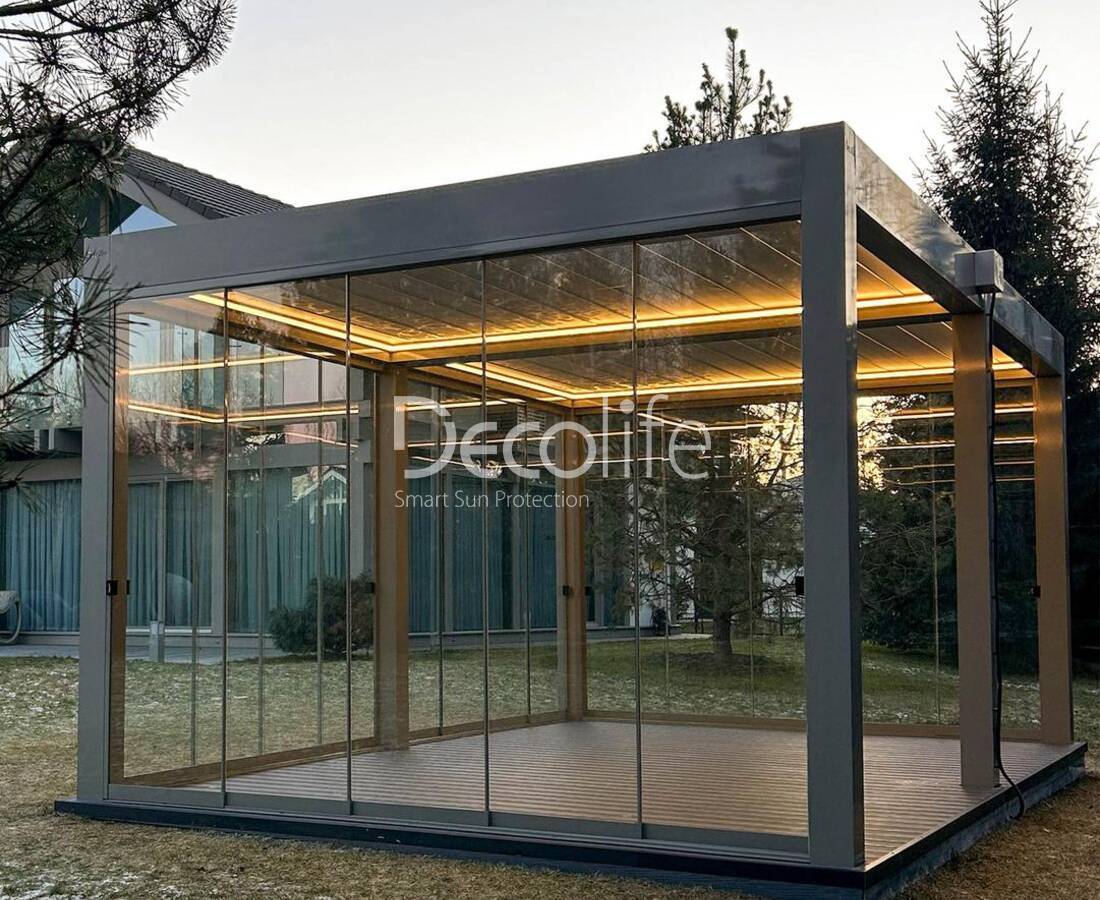 The recommended panel height is 3 meters, the maximum number of glass panels is 12 pcs. Compatible with the entire Decolife range of pergolas.